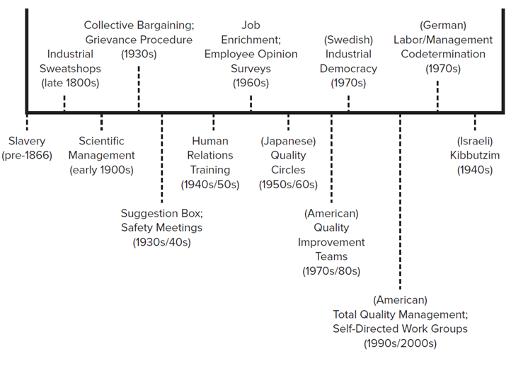 Work systems and techniques for employee participation are arranged along a continuum.Employees on the left have less power and involvement in decision-making. Employees on the right are more involved, yet not so participative that owners and managers fear loss of power and ownership.